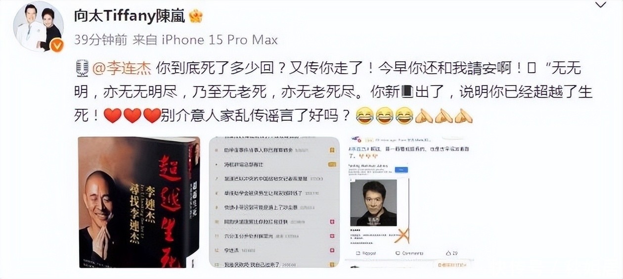 向太得知此事后忍不住在微博发声:“李连杰开追悼会?怎么没请我?”